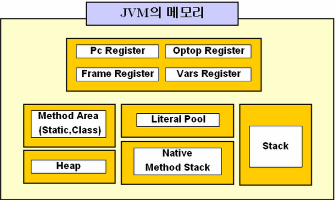 크게 Method Area, Heap Area, Stack Area, PC Register, Native Method Stack로 나눌 수 있다.