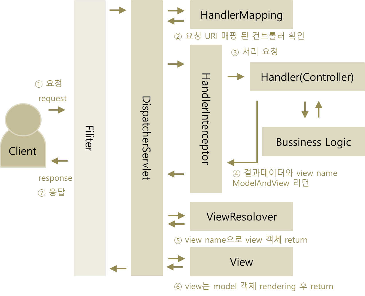 인터셉터의 작동 위치 ? : 인터셉터는 DispatcherServlet에서 Controllr(Handler) 사이에서 동작